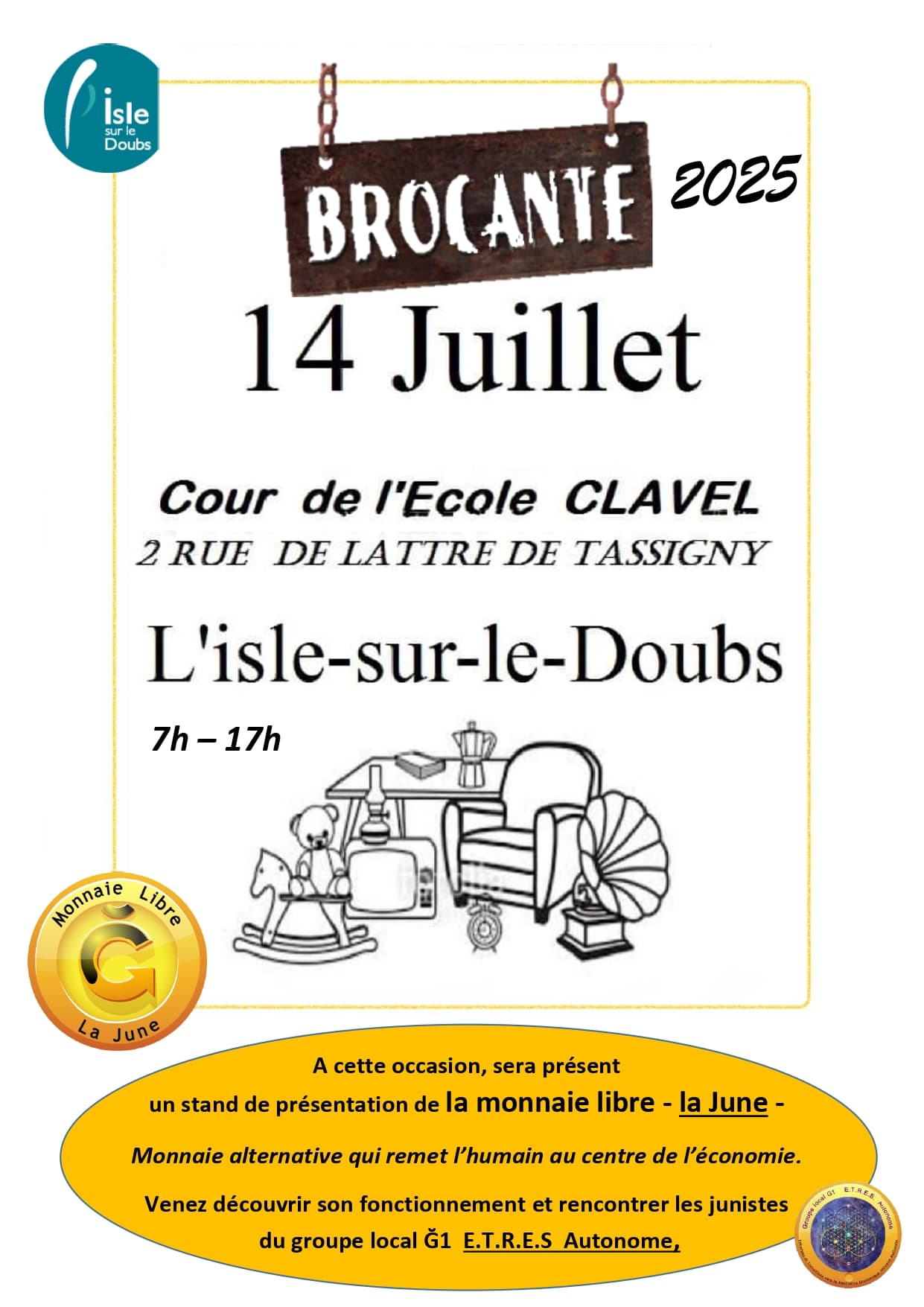 Comme l’année passée, les junistes locaux seront présents sur le grand marché aux puces de l’Isle-sur-le-Doubs le 14 juillet, avec un stand de présentation de la G1.