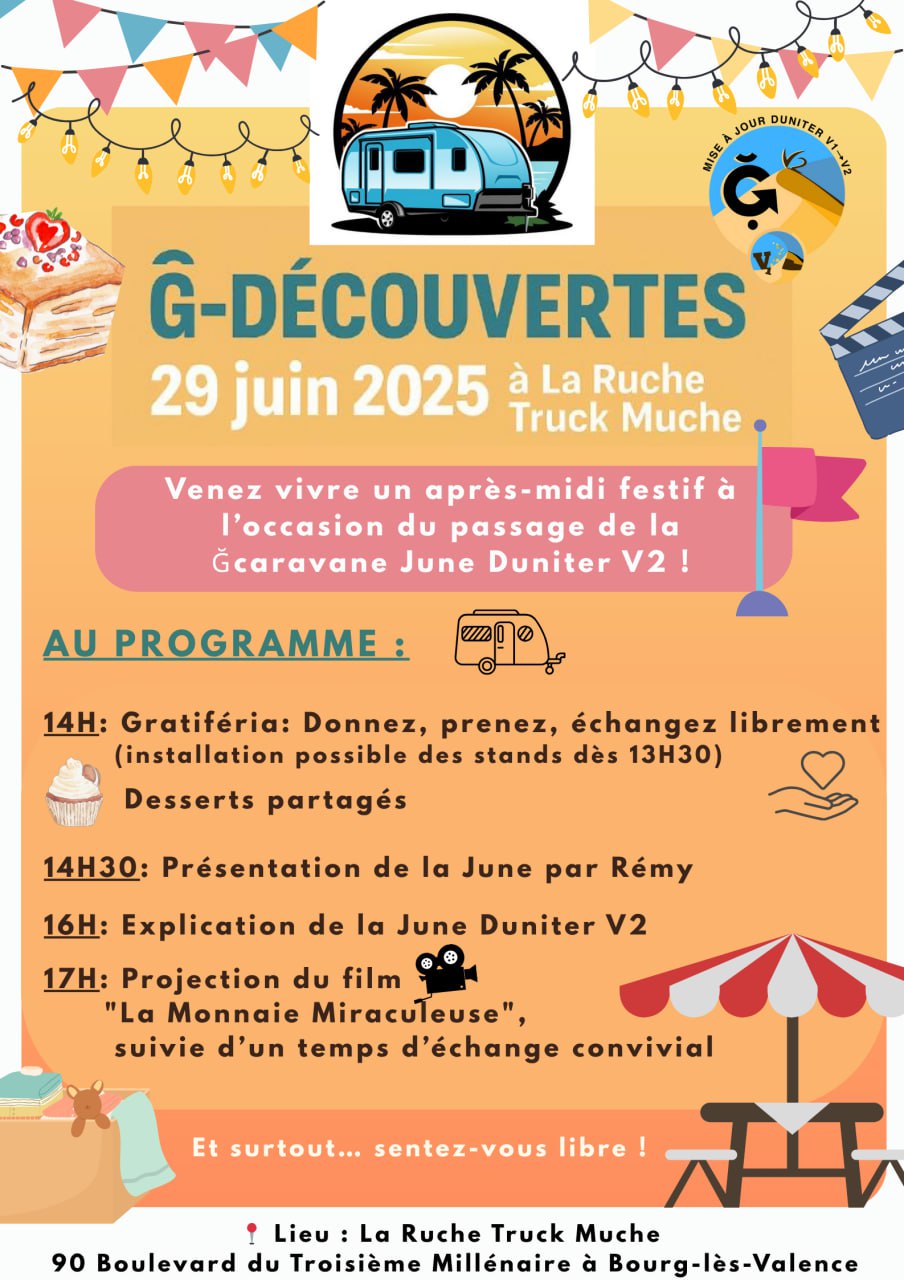 Venez vivre un après-midi festif de rencontres, découvertes et de partages à l’occasion du passage de la Ğcaravane June Duniter V2 !