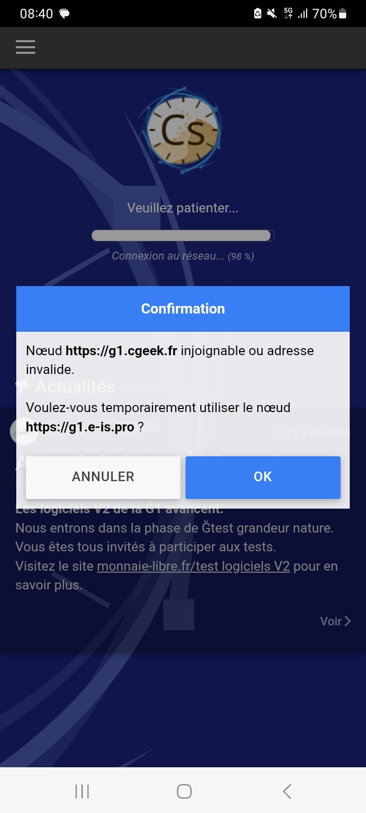 Le bug de connexion à Cesium était réglé ces derniers jours mais cela recommence, impossible de se connecter… Noeuds injoignables même en mode expert impossible de choisir un noeud… reste bloqué à 98%… Belle et bonne journée à vous.