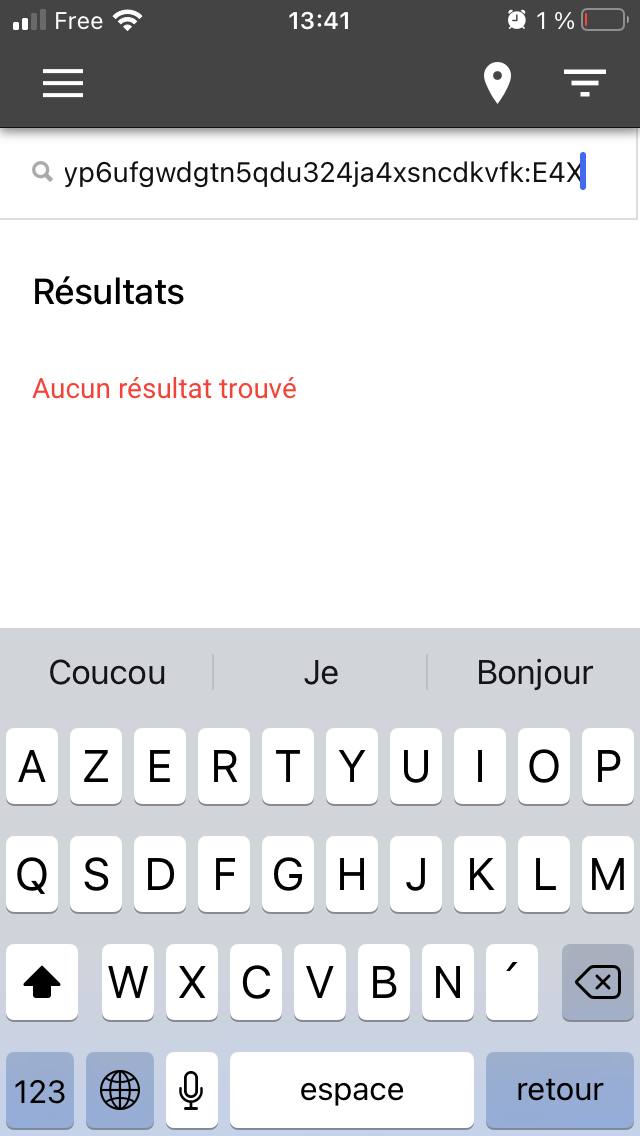sur mon tel qui a la version 1.7.14, Ce est plus étonant, c’est que je ne peux pas trouver non plus les portefeuilles en cherchant avec la clé complète dans l’annuaire. En faisant un copié/coller, ça indique « aucun résultat trouvé » voir copie écran.