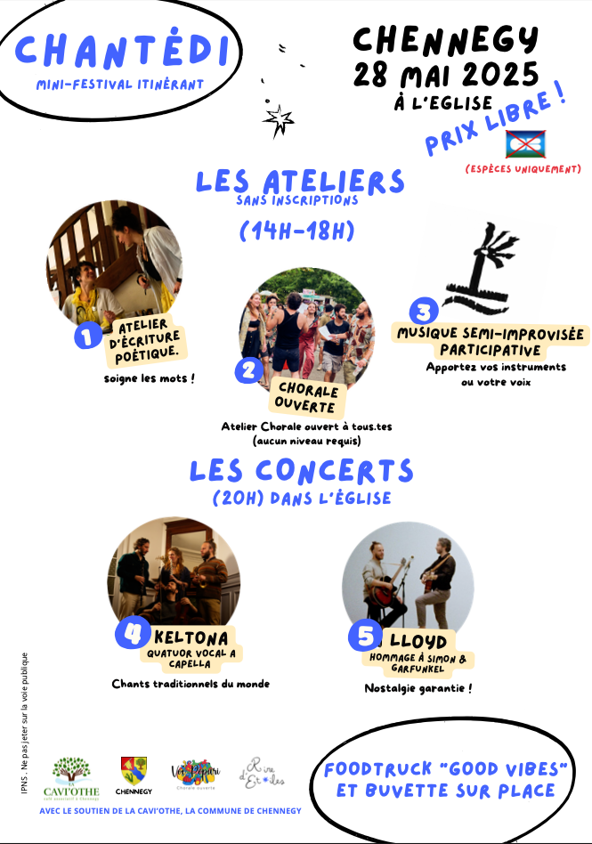 L’évènement en question s’appelle « Chantédi » et c’est un ensemble d’ateliers ouverts à tous et de concerts le soir, dans l’Eglise de Chennegy s’il vous plait !