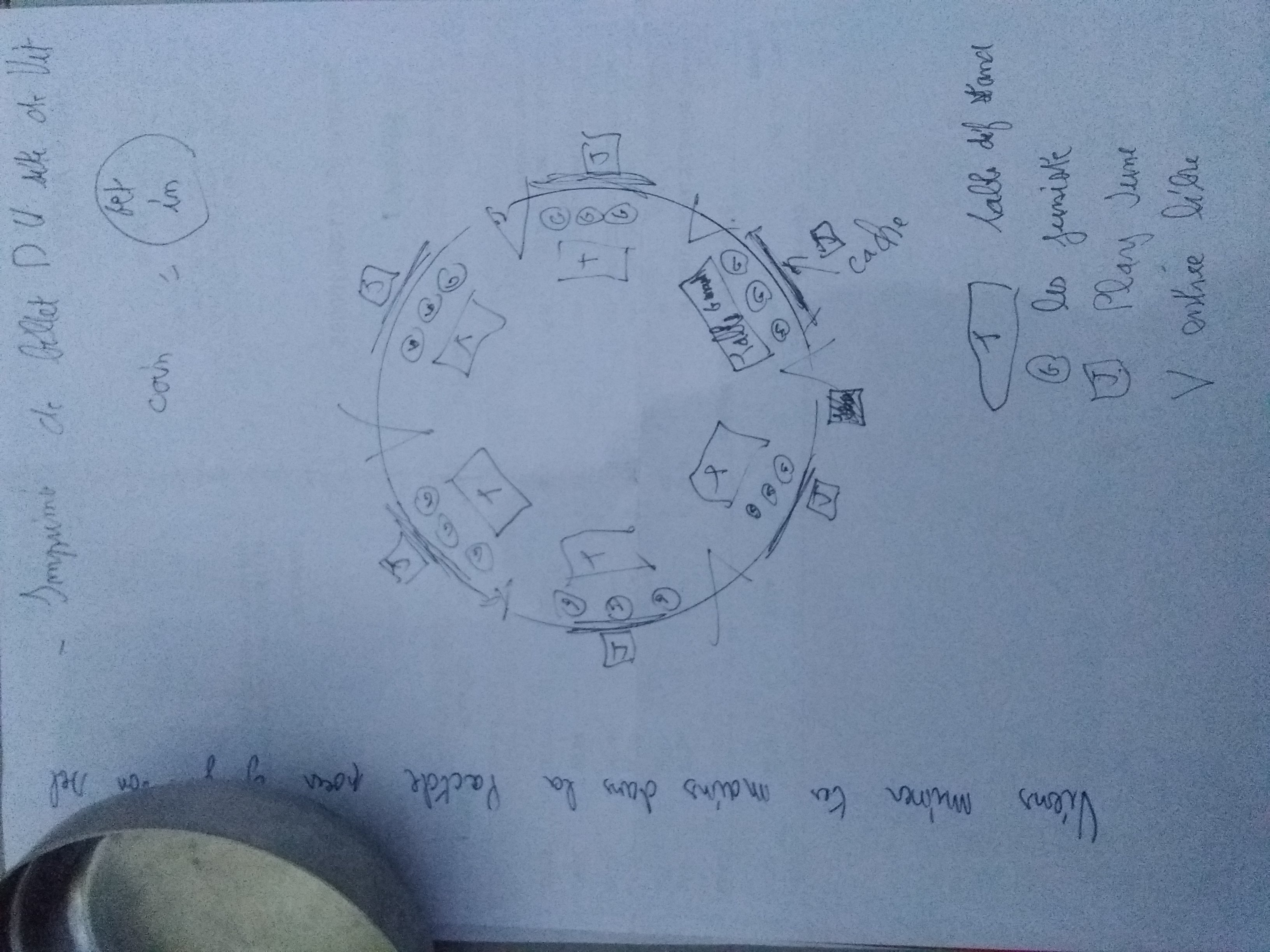 Pour la réalisation : Matériel (un banc, un bac noir, des coins junes en métal, du tissu noir, de quoi afficher les régler du jeux, « je peux en faire une pirogravure, mais il me faut du temps, pour le style »)