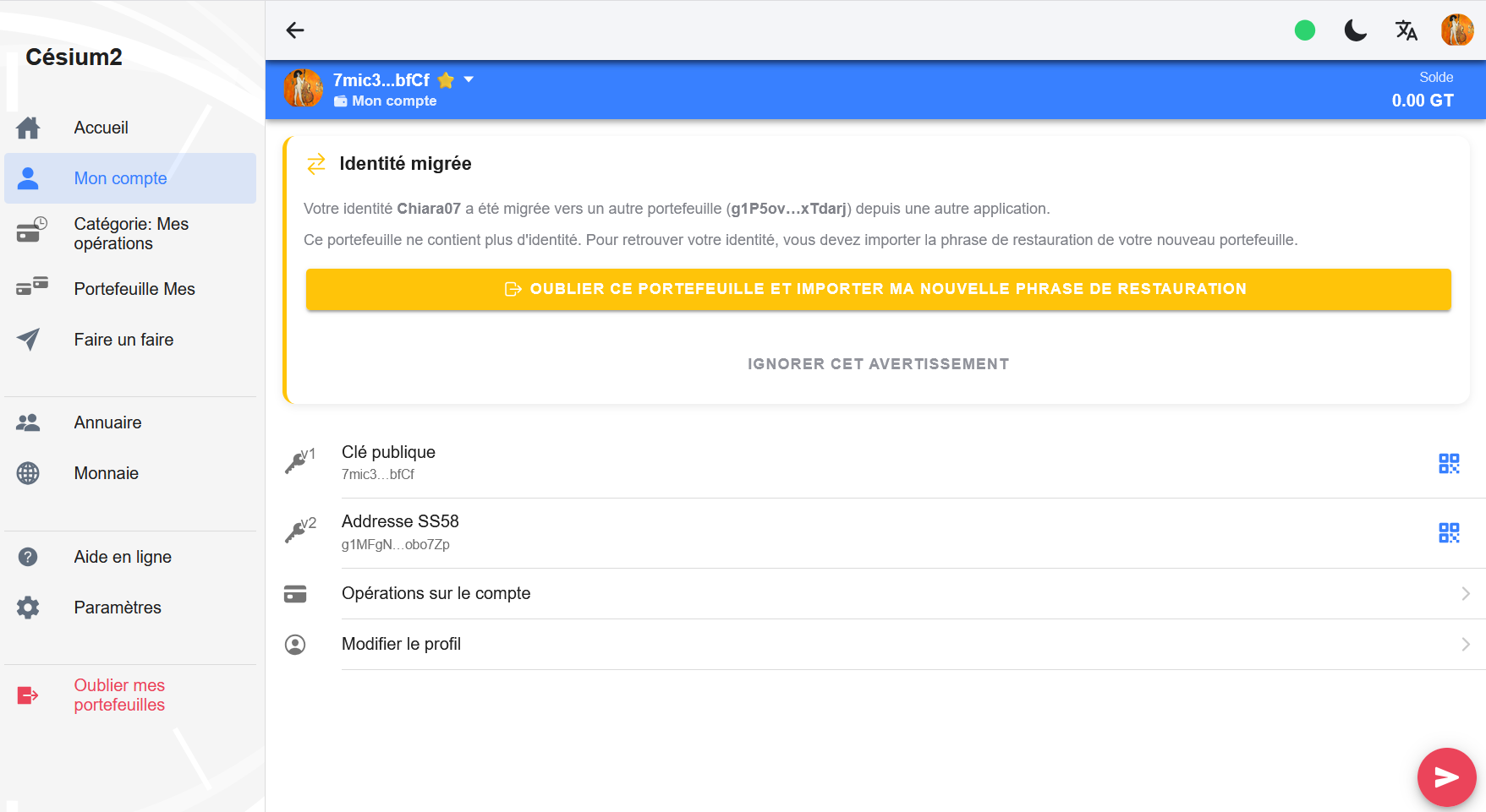 C’est pour cela qu’il propose la migration de compte, c’est-à-dire le transfert des junes et du reste (pour les comptes membres), dans un compte généré par les 12 mots.