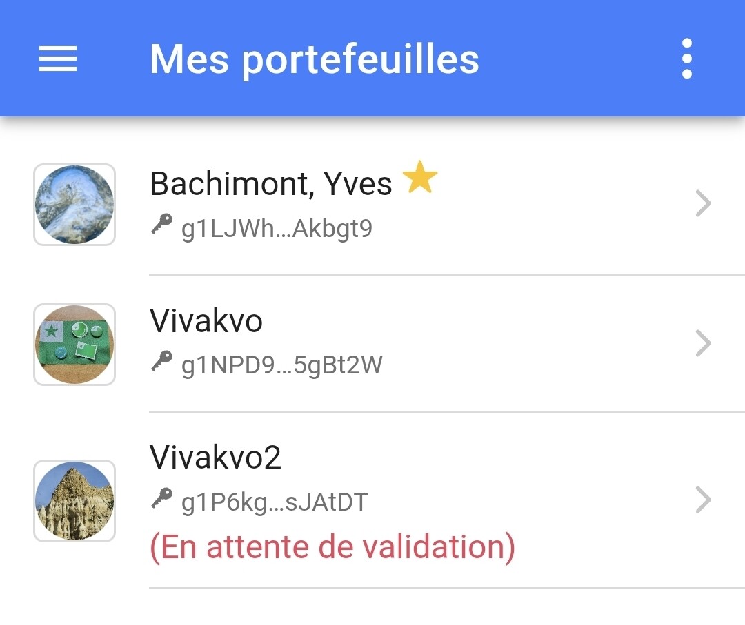 Sur la version de Cesium2 sur téléphone (appli apk), ces 3 points verticaux ne sont pas visibles, donc je ne peux pas changer le portefeuille par défaut.