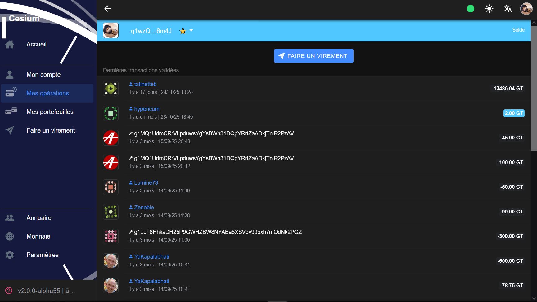 Mon solde apparaît à 0 GT, et dans les opérations on voit un retrait correspondant à la totalité de mon compte.