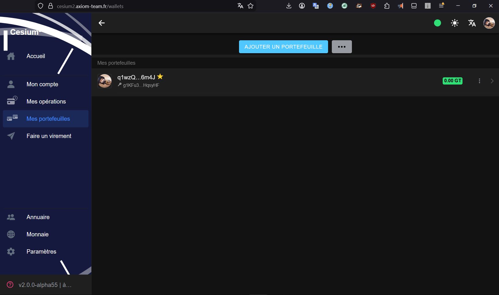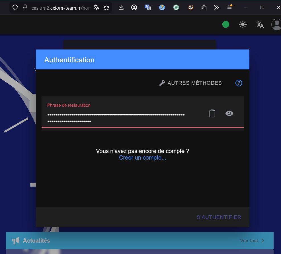 Je me suis ensuite déconnecté et reconnecté via le compte de ma fille, et là j’ai pu voir mon solde normal. Comme j’avais déjà importé ce compte dans un coffre Gecko, j’ai essayé de copier ma phrase secrète via le bouton “copier” de Gecko pour la coller dans Cesium, mais l’onglet “S’authentifier” ne s’affiche pas.