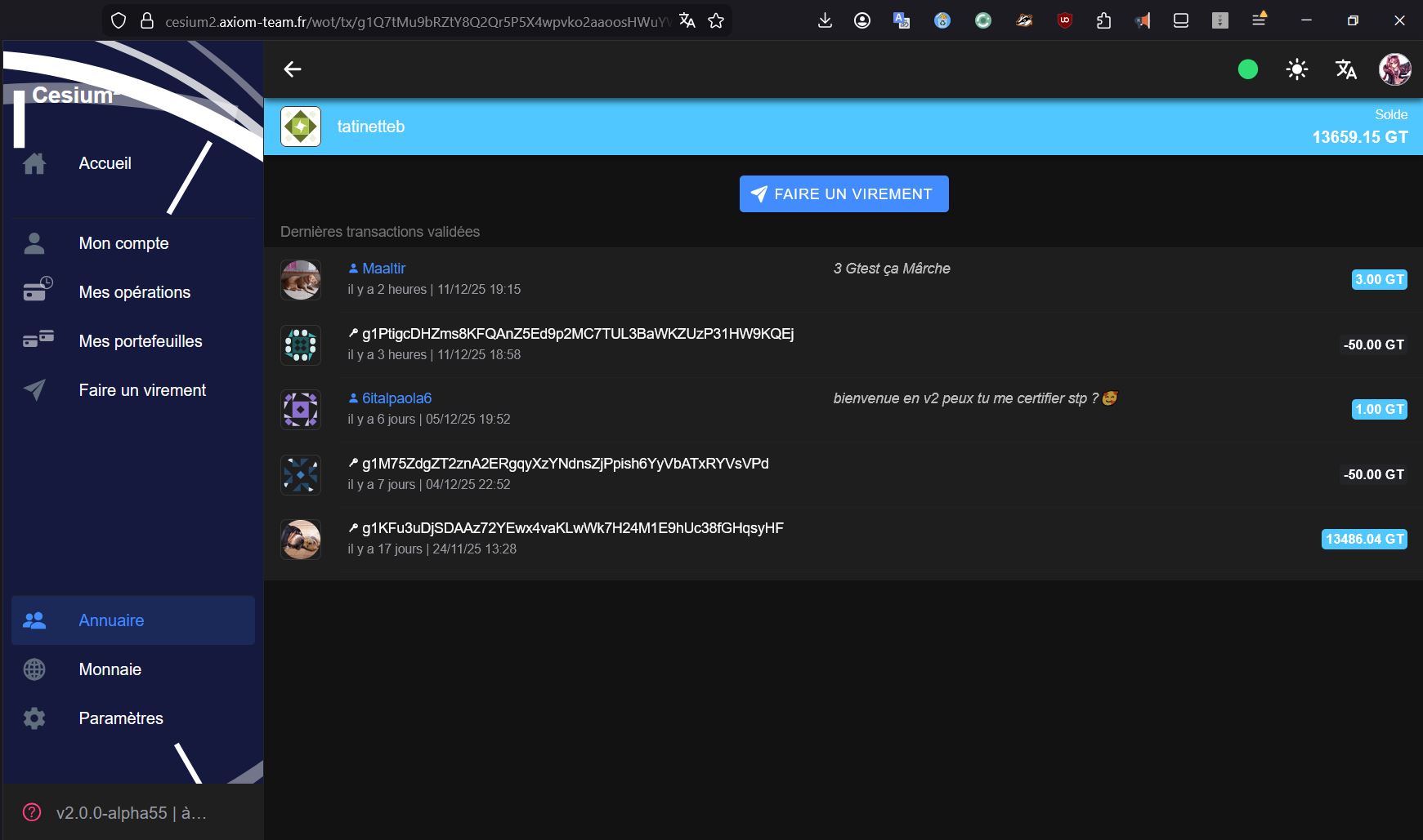 Dans mon deuxième test, je me suis connecté à mon compte membre déjà existant et j’ai du rentrer l’identifiant puis le mot de passe de mon compte membre de duniter 1. Césium test 2 m’a demandé de créer un nouveau mot de passe ce que j’ai fait, mais je n’ai pas eu la liste de 12 mots à noter. Je suis arrivé sur mon compte membre mais je n’ai pas pu voir mes certifications. Je suis allé chercher mon compte membre via l’annuaire et j’ai pu voir mes certification émises et reçus. Ainsi la page qui mène sur “mon compte” n’est pas exposé de la même manière que la page de mon compte membre lorsque je le cherche via l’annuaire. J’ai ensuite testé de certifier un compte que j’ai trouvé sur l’annuaire et je n’ai pas de bouton pour certifier. J’ai ensuite tenté de faire un virement mais je n’ai pas le solde suffisant.