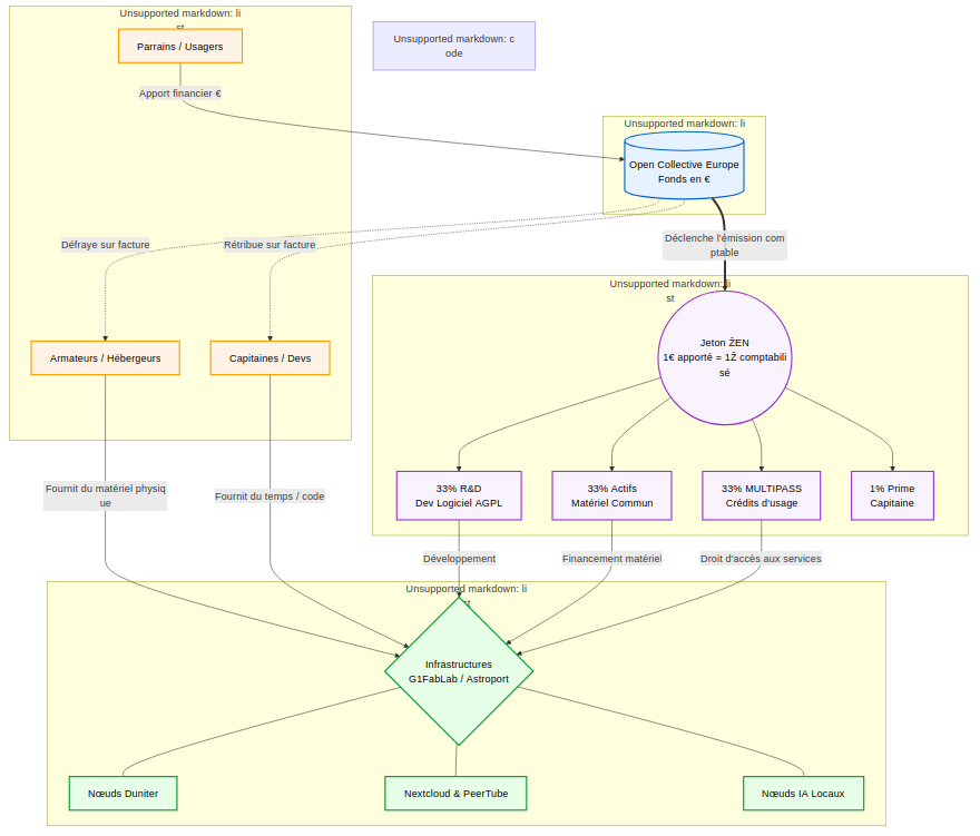 - L’entrée de la valeur : Des membres (Parrains/Usagers) apportent des euros via Open Collective (une fondation transparente, sans actionnaires). En parallèle, des Armateurs apportent du matériel physique, et des Capitaines apportent du temps.