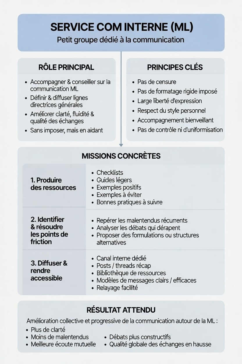 Ce groupe n’aurait pas vocation à tout contrôler, mais à jouer un rôle de réflexion, de pédagogie et d’accompagnement bienveillant sur tout ce qui touche à la communication générale autour de la ML.