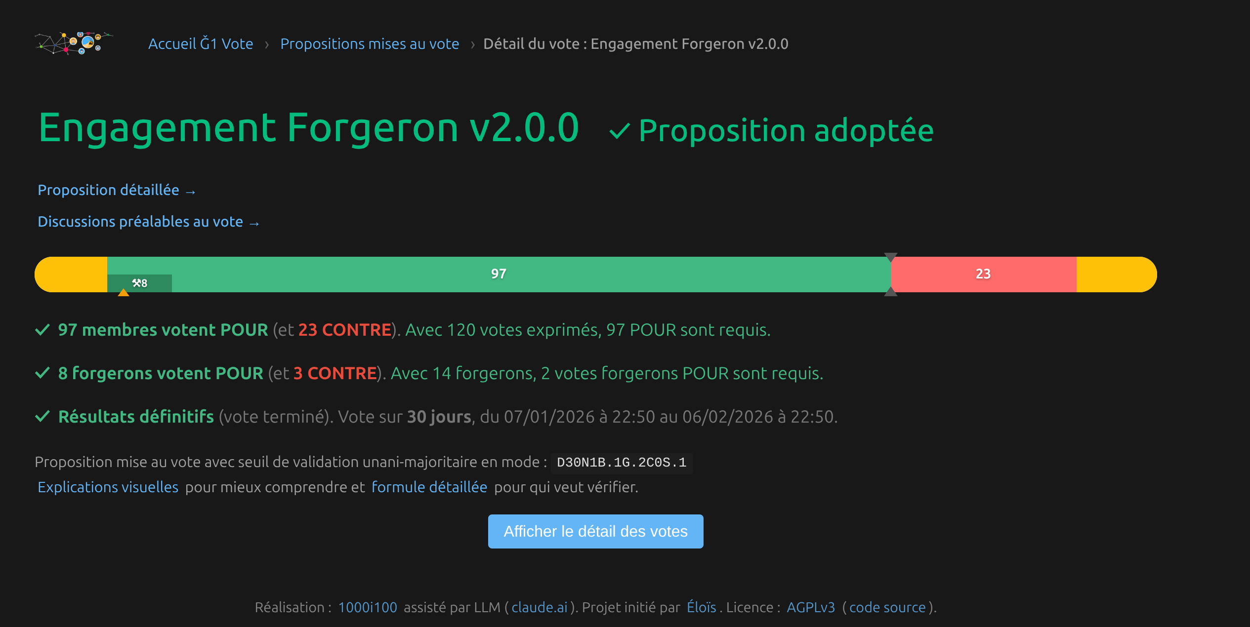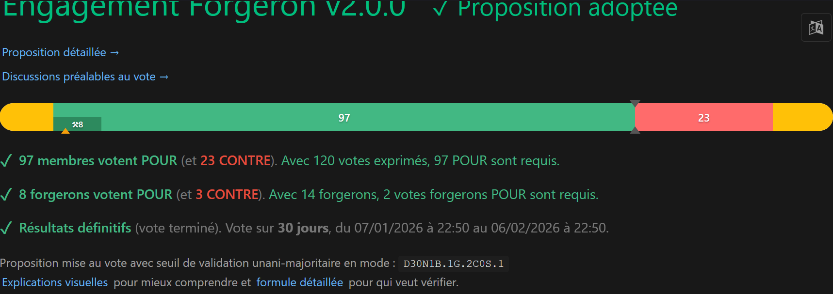 Nous vous proposons un système de vote unani-majoritaire via votre compte monnaie libre pour exprimer votre accord ou désaccord sur l’adoption de l’engagement forgeron. Ouverture des votes : du 7 janvier au 6 février 2026.