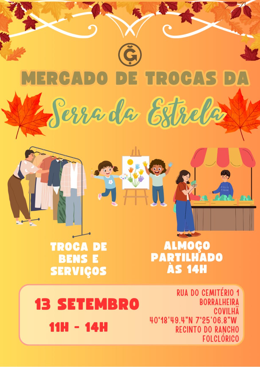 Sejam todos bem-vindos no próximo sábado dia 13 de Setembro pelas 11:00 ao Mercado de Trocas da Serra da Estrela. Dão um maravilhoso passeio, trocam algo que já não precisem e que outra pessoa possa necessitar e ainda…fazem novos amigos. Vem reforçar a rede de confiança dentro do verdadeiro conceito de economia livre!